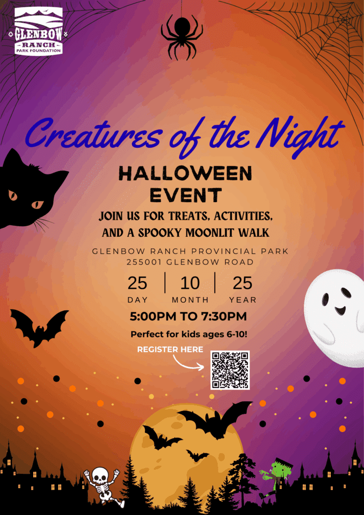 Join us after dark at Glenbow Ranch Provincial Park for a thrilling family night you won’t forget! Discover the mysterious world of bones, skulls, spiders, bats, owls, and other eerie creatures that come alive when the sun goes down.