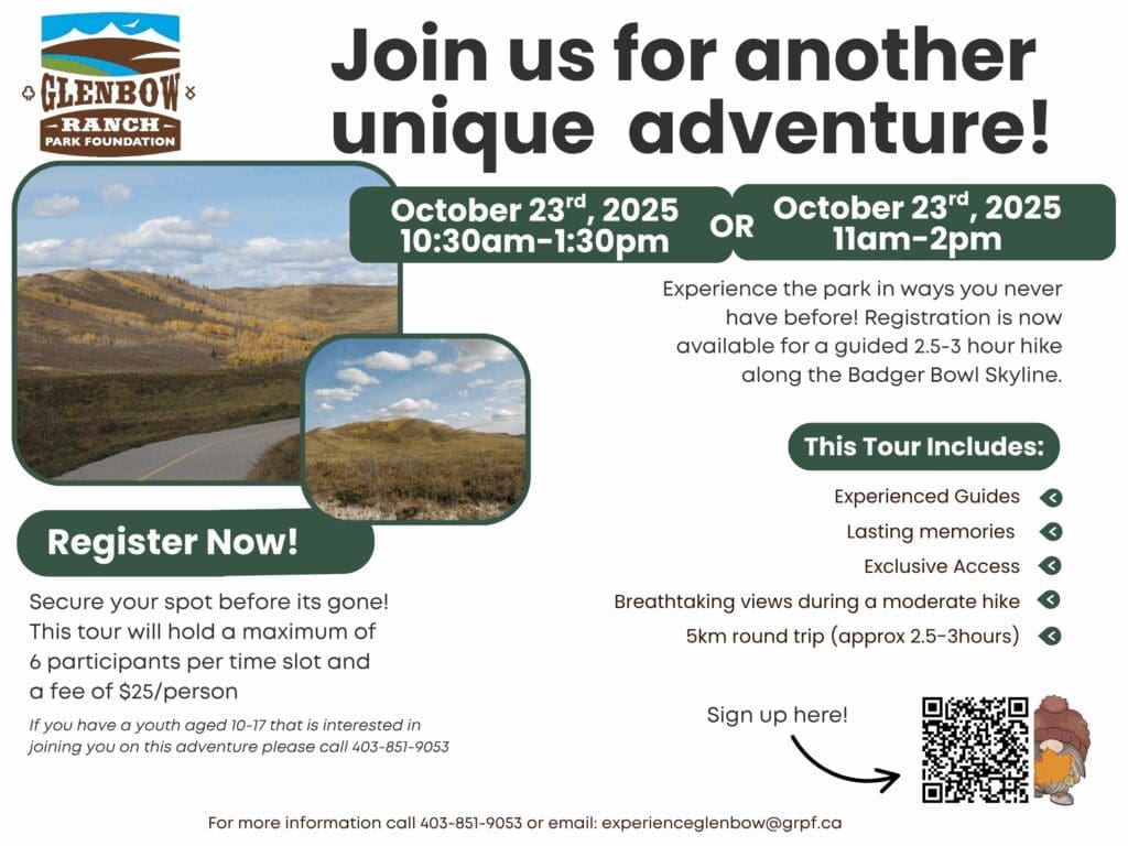 Step off the beaten path and into the dramatic landscapes of Glenbow Ranch. This challenging journey will take you along the spectacular skyline of the ridge surrounding Badger Bowl. You will be climbing up to the ridgeline and traversing into one of the restricted areas of the park, exploring steep slopes, coulees, and incredible vistas. This 5.0km hike takes you from Bowbend Junction up the skyline to Windmill Lookout and back. This is not your average walk in the park. It will be an adventure with elevation gains and losses and uneven terrain to conquer that leave you with lasting memories.